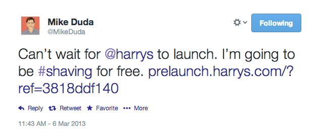 Ours was really, really simple: “Excited for @harrys to launch. I’m going to be #shaving for free” with a shortlink back the campaign site.