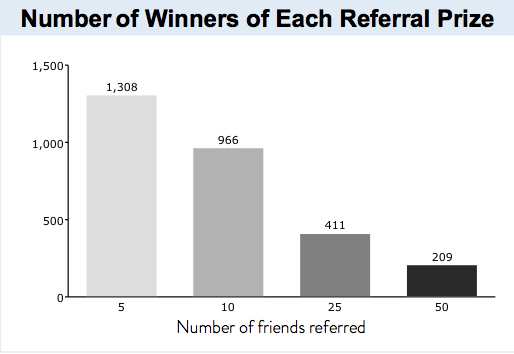 The fundamental mechanic of our campaign was a game: complete the challenge of referring friends and earn prizes. It seems pretty straightforward—and it is—but we think that what those prizes are, and how they are doled out, is critical to getting people excited play. Not all reward structures are created equal. Here are a few things what worked for us.