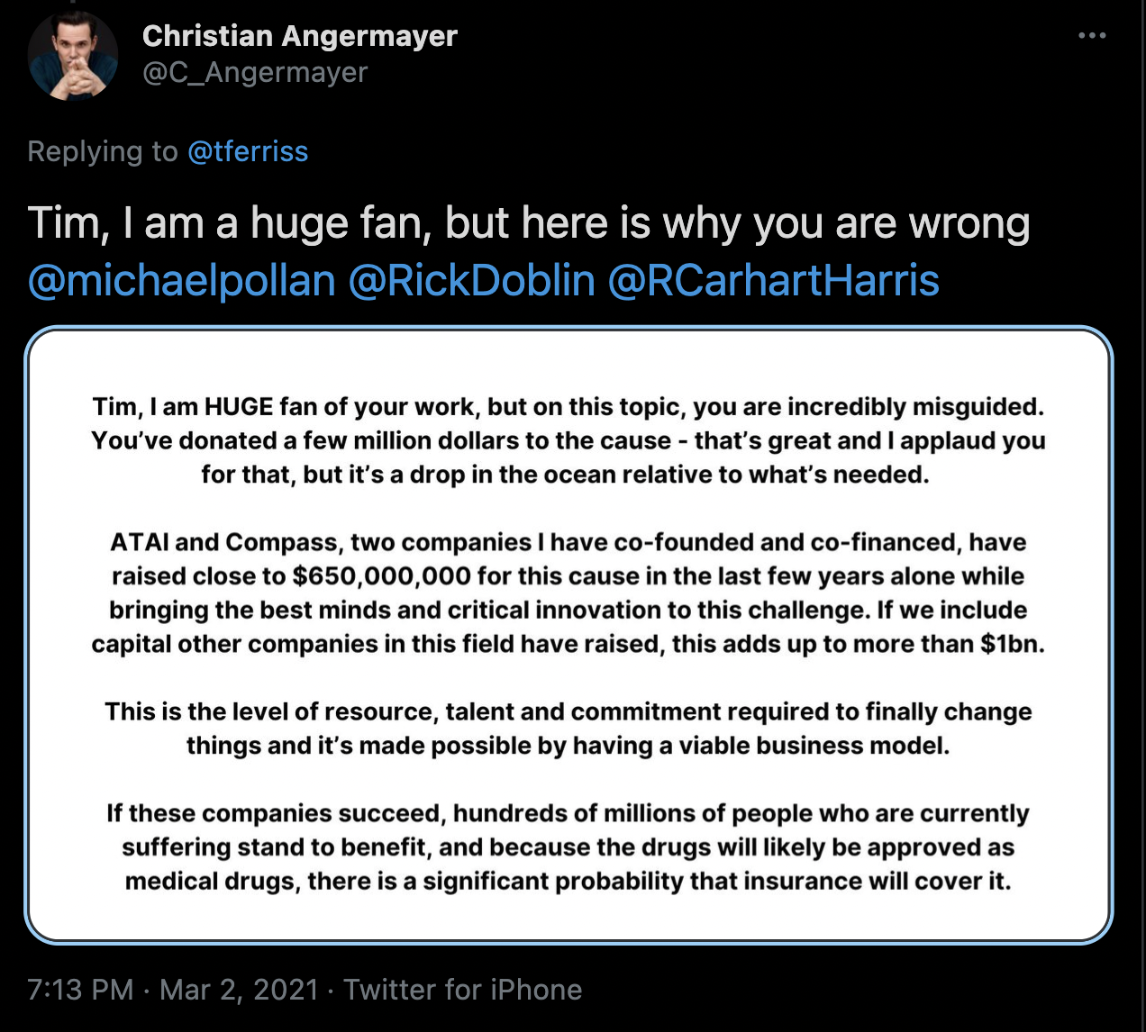 One response that got quite a bit of attention was from Christian Angermeyer, who has co-funded and co-founded two notable for-profit companies in the space, Compass Pathways and ATAI Life Sciences, respectively.